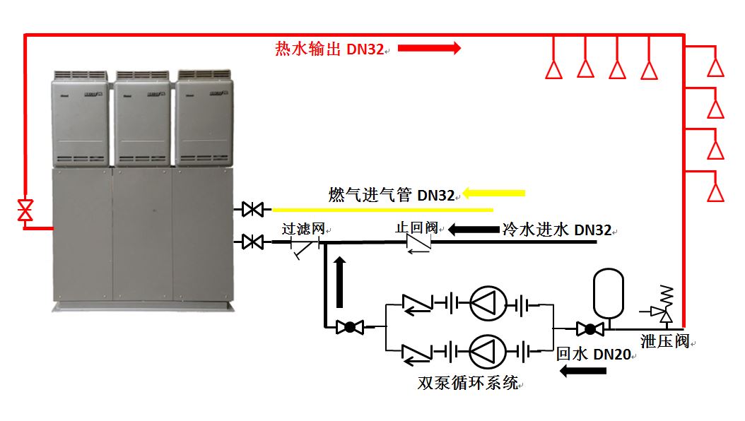 5、恒流:在确保燃气、水电供应的情况下,系统能确保提供不断流的恒温的热水。